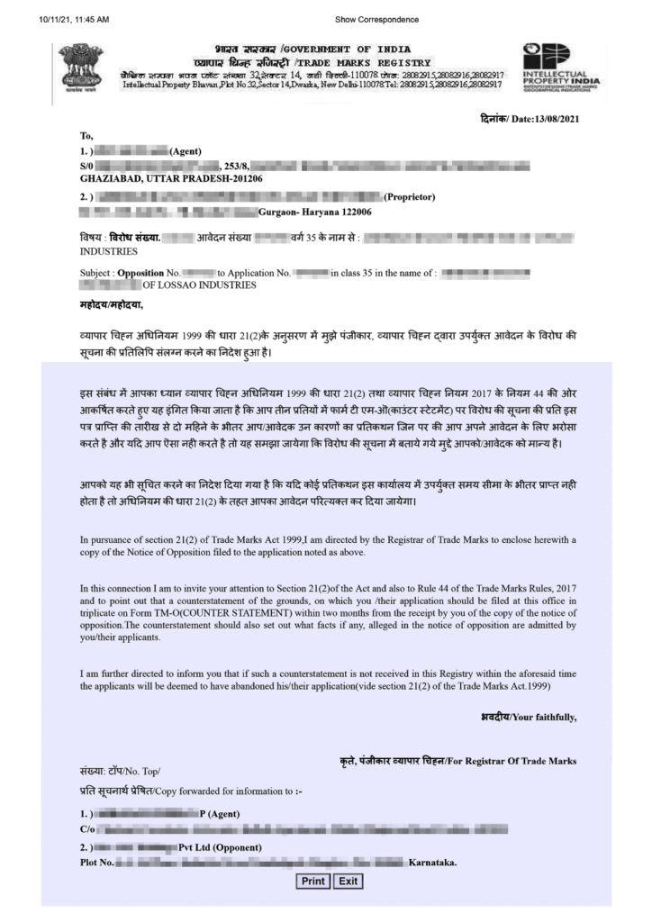 - Details of the opposed trademark (application number, class of goods/services, applicant name).